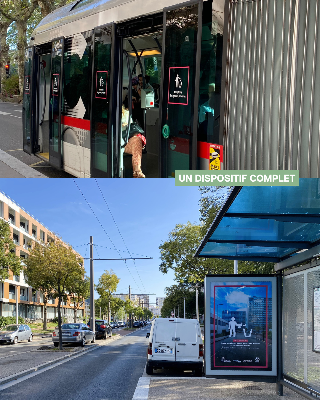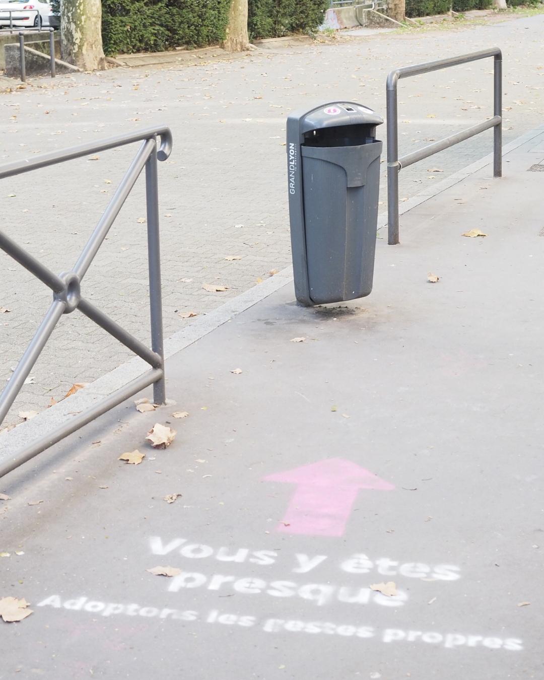 À Rillieux-la-Pape, des observations menées par Gestes Propres avec la métropole de Lyon ont montré que des équipements gris sur des supports gris finissent par se fondre dans le décor, et devenir pratiquement invisibles. Le geste de jeter ne devient alors évident que si la poubelle saute aux yeux. L'expérimentation souligne que la distance et la difficulté d'accès sont les facteurs déterminants du passage à l'acte. En l'absence de repère visuel, l'usager peut se fier au comportement des autres.