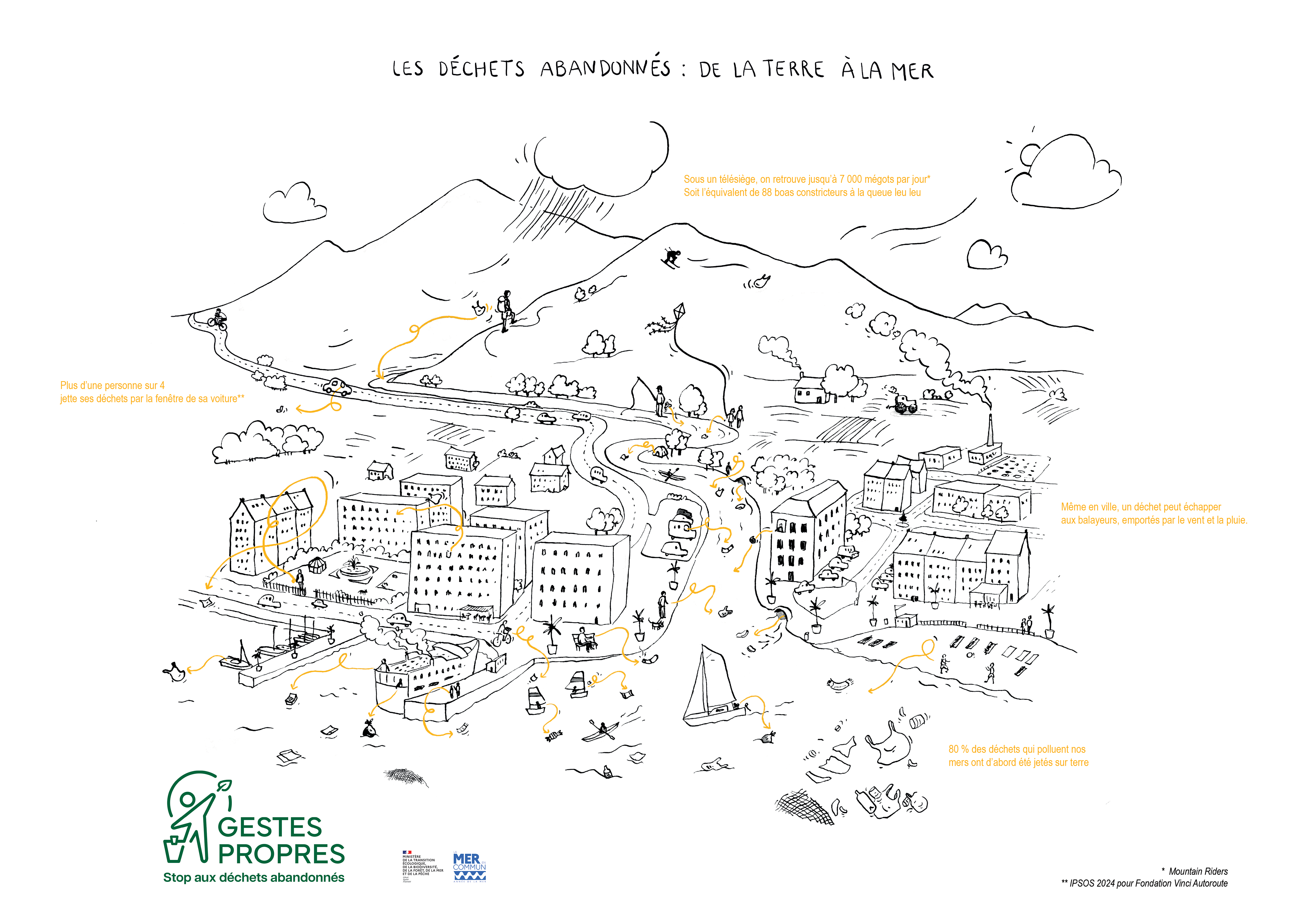 Avec ce coloriage pédagogique, les enfants comprendront le long parcours que font les déchets abandonnés à terre jusqu’aux mers et océans.